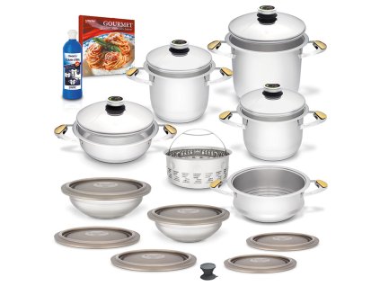 Misky různých velikostí lze použít pro přípravu, práci a skladování všech druhů potravin. Jsou ideální jako poklice pro zvětšení objemu nádoby. Umožňují vaření nad sebou a lze je také použít jako plochu pro ohřívání potravin Inovativní technologie Zepter.